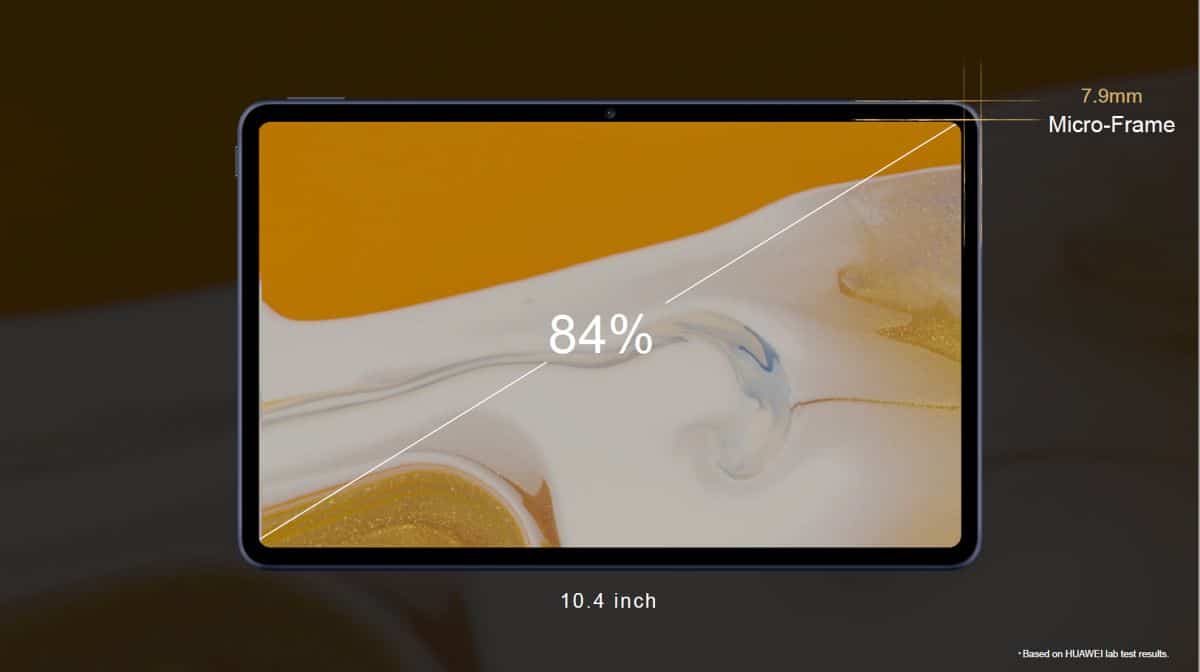 จุดเด่นแรกที่ไม่พูดถึงคงไม่ได้สำหรับ MatePad ก็คือหน้าจอใหญ่แทบไร้ขอบขนาด 10.4 นิ้ว ที่มีอัตราส่วนระหว่างหน้าจอหน้าจอต่อตัวเครื่องถึง 84% และมีขอบบางเพียง 7.9 มม. เท่านั้น นอกจากนี้ยังส่งมอบภาพที่คมชัดด้วยหน้าจอแสดงผลแบบ IPS LCD ความละเอียดสูง 2000 x 1200 พิกเซล และยังมาคู่กับลำโพงขนาดใหญ่ 4 ตัว พร้อมระบบเสียงที่ได้รับการปรับแต่งโดยแบรนด์เครื่องเสียงชื่อดังอย่าง Harman Kardon อีกด้วย เรียกได้ว่าทั้งภาพและเสียงมาเต็มสำหรับสายบันเทิง
