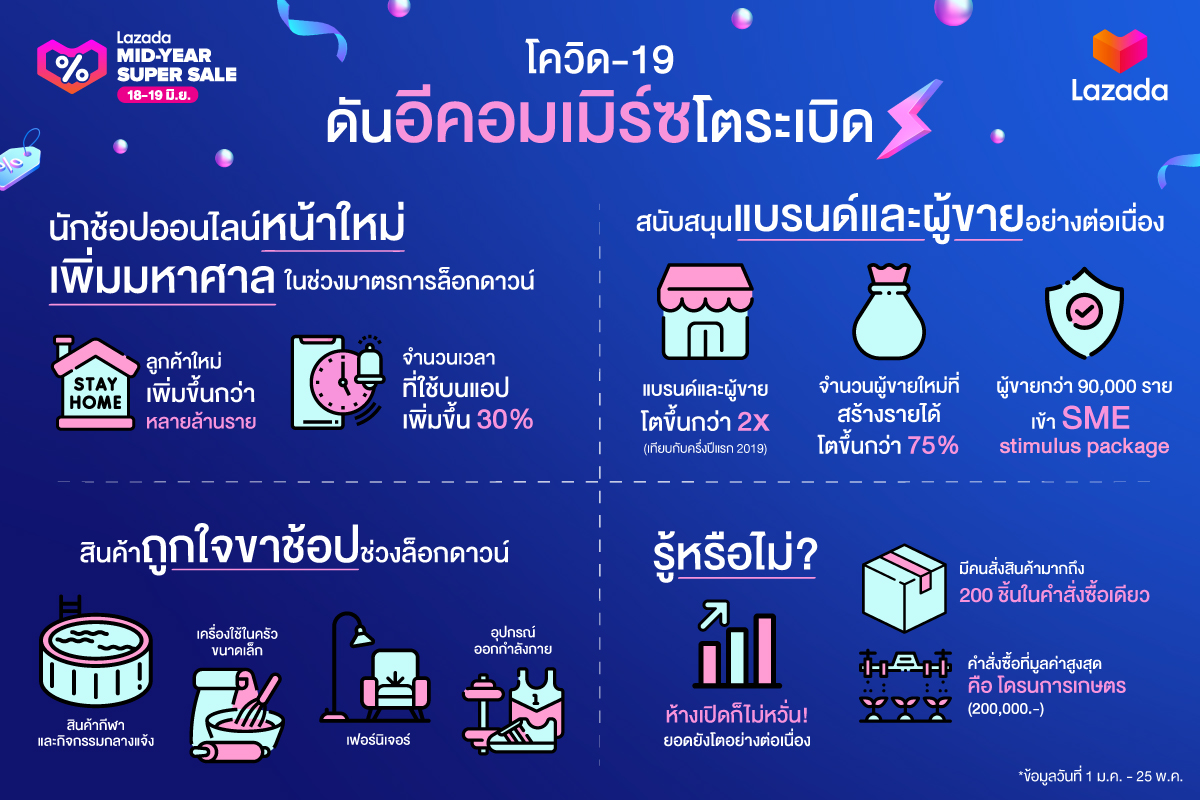 นอกจากนี้ ตั้งแต่เดือน มี.ค.ที่ผ่านมา มีนักช้อปรายใหม่ในไทยเป็นจำนวนหลายล้านราย และมีจำนวนผู้ขายรายใหม่ที่สามารถสร้างรายได้บนแพลตฟอร์ม เพิ่มขึ้นกว่า 75% และคาดว่า แคมเปญ ‘Lazada Mid-Year Super Sale’ จะเป็นแคมเปญที่ช่วยขับเคลื่อนและต่อยอดเทรนด์การเติบโตของอีคอมเมิร์ซในไทย