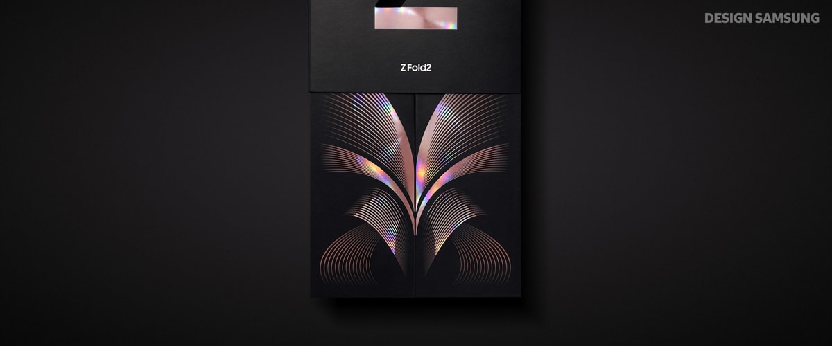 อีกหนึ่งรายละเอียดที่ซัมซุงตั้งใจออกแบบเพื่อสร้างความประทับใจตั้งแต่แรกสัมผัส คือดีไซน์ของแพคเกจจิ้งด้านนอก โดยซัมซุงได้แฝงลูกเล่นที่ถ่ายทอดอัตลักษณ์ของ Galaxy Z Fold2 5G ไว้อย่างแยบยล ไม่ว่าจะเป็น ทิศทางการเปิดกล่องออกตามแนวด้านข้างเช่นเดียวกับลักษณะการกางเครื่อง หรือลวดลายกราฟฟิกบนกล่องที่คล้ายคลึงกับภาพ Lock Screen รวมถึงการจัดวาง Layout ของแผ่นพับคู่มือที่แบ่งออกเป็น 2 คอลัมน์แนวตั้ง เพื่อให้สอดคล้องกับหน้าจอของ Galaxy Z Fold2 5G