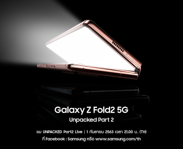กรุงเทพฯ (31 สิงหาคม 2563) – ซัมซุง อิเลคโทรนิคส์ ผู้นำด้านนวัตกรรมและเทคโนโลยีระดับโลก เตรียมเปิดตัวสุดยอดนวัตกรรมที่ยิ่งใหญ่ที่สุดของซัมซุงกาแลคซี่ “Galaxy Z Fold2 5G” (กาแลคซี่ ซี โฟลด์ 2 5G) สมาร์ทโฟนหน้าจอพับได้เจเนอเรชันที่ 3 อย่างเต็มรูปแบบ ในงาน “Galaxy Z Fold2 5G: Unpacked Part 2”